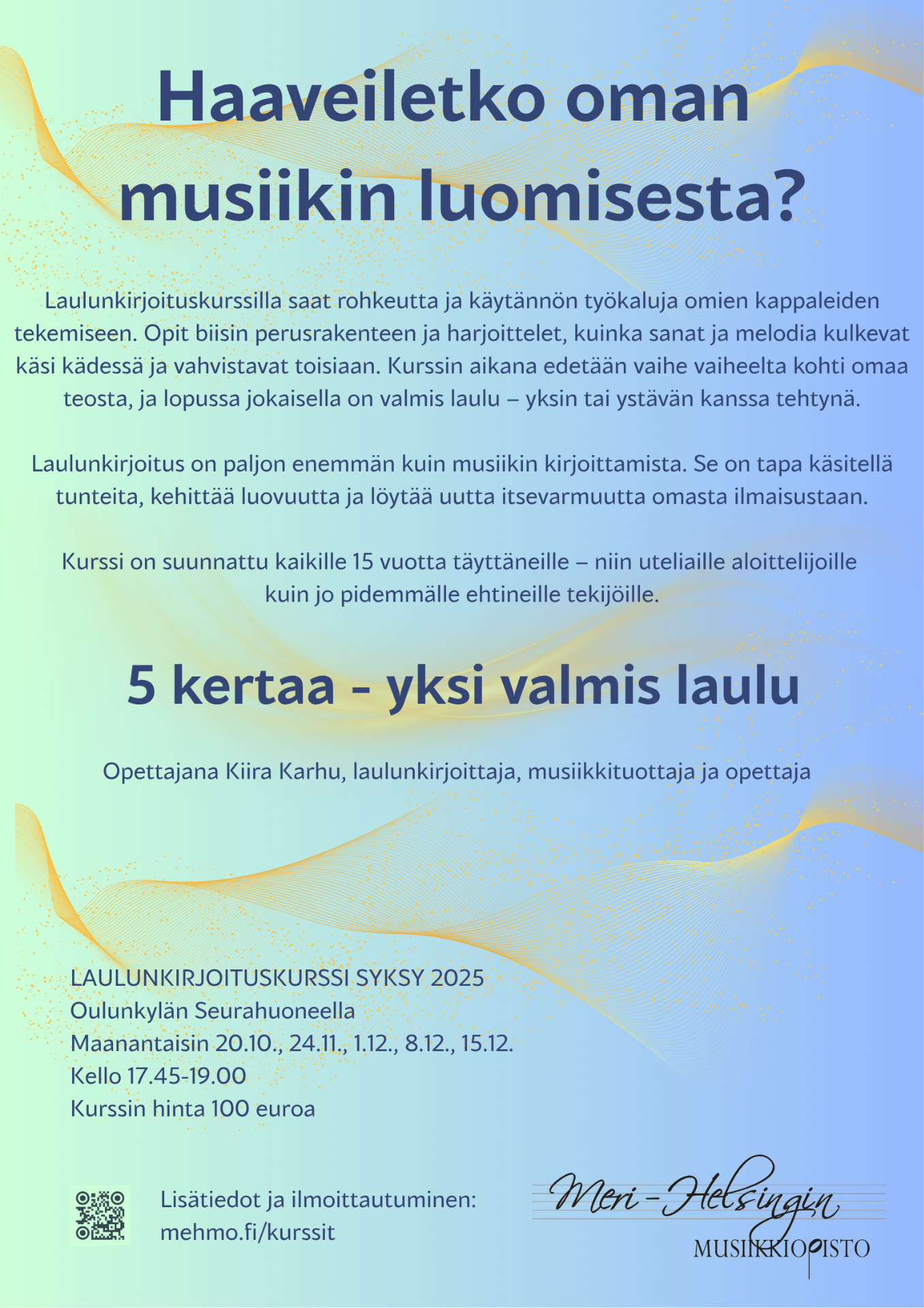 Olitpa sitten aloittelija tai jo hieman laulunkirjoitusta harjoitellut, tällä kurssilla saat konkreettisia työkaluja ja rohkeutta omien laulujesi luomiseen. Kurssilla pureudutaan laulun anatomiaan, eli opit mitä ovat säkeistö, kertosäe ja silta ja kuinka ne rakennetaan toimivaksi kokonaisuudeksi. Perehdymme myös sanoitusten saloihin ja siihen, kuinka teksti voi luoda tunnelmia ja kertoa tarinan. Lisäksi opit, kuinka melodia ja rytmi tukevat sanoituksia, ja saat käytännön ohjeita korvaan jäävien koukkujen tekemiseen. Kurssikertojen väleihin opettaja antaa oppilaille tehtäviä itsenäiseen tekemiseen